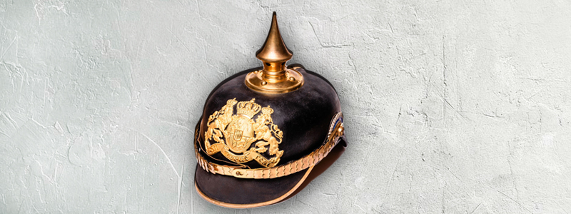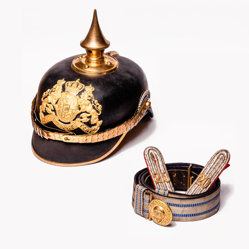 Militärische Helme, Pickelhauben und weitere Kopfbedeckungen – mit oder ohne Abzeichen.