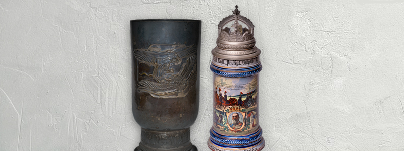 Reservistenkrüge mit Motiven, Namen und Einheiten – auch beschädigte Stücke.
